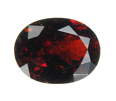 This stone is a deep red color gem that is slightly included and has an oval cut.