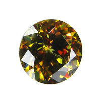 This round cut, eye clean gem has a bright yellow-green to orange color.